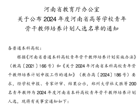近日,河南省教育厅下发《关于公布2024年度河南省高等学校青年骨干教师培养计划人选名单的通知》(教办高〔2024〕275号),raybet官网田瑞敏、郭东光、潘鹏涛等3名教师入选2024年度河南省高等学校青年骨干教师培养计划。